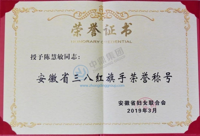 安徽中鼎控股(集團(tuán))股份有限公司婦委會主任、集團(tuán)工會女工部部長陳慧敏被授予“安徽省三八紅旗手 ”榮譽(yù)稱號。