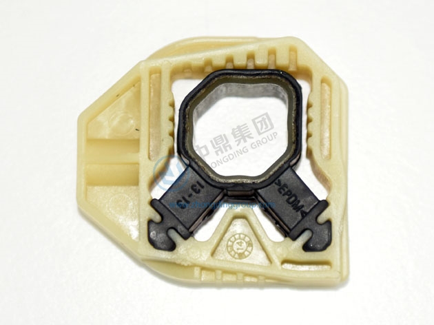 散熱器支架:用于汽車(chē)散熱器系統(tǒng),起到支撐及固定減震降噪的作用,內(nèi)襯PA66+GF30,材料EPDM