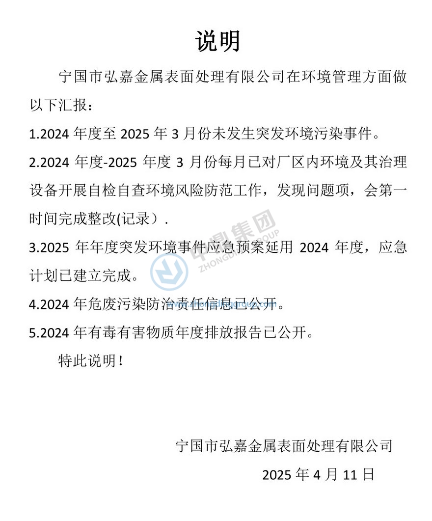寧國市弘嘉金屬表面處理有限公司 材料環(huán)保審核材料公示